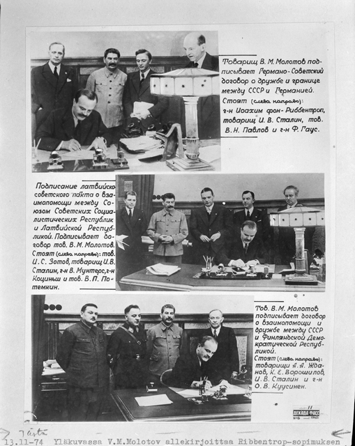 Lehtileike valokuvineen Molotovista allekirjoittamassa kolmea eri sopimusta. Molotov–Ribbentrop-sopimusta allekirjoitetaan ylimmässä kuvassa. Kuva: Museovirasto – Musketti, Historian kuvakokoelma.