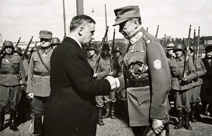 Pääministeri Edwin Linkomies onnittelee Mannerheimiä tämän tultua valituksi presidentiksi elokuussa 1944. Museovirasto.