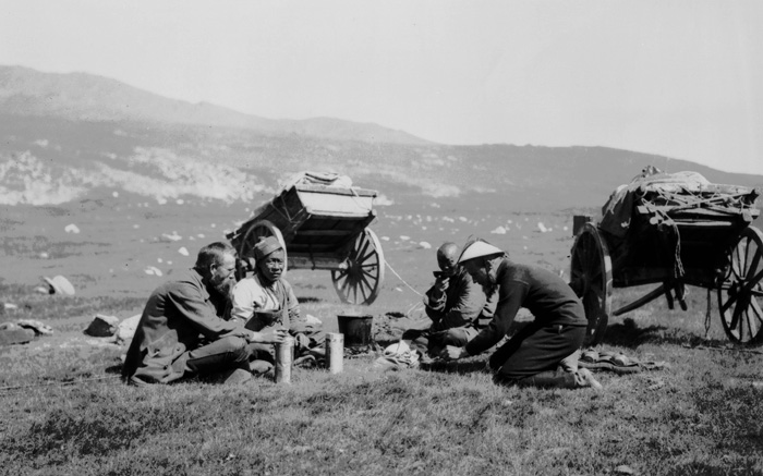Mongolian retkikunnan jäsenet ruokailevat nurmikolla: G. J. Ramstedt ja Sakari Pälsi sekä heidän mongolipalvelijansa Dardza ja Baldzir 1909. Kuva Sakari Pälsi Museovirasto.