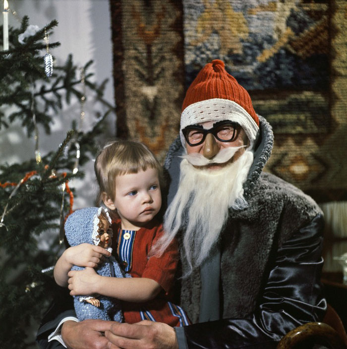 Lapsi joulupukin sylissä jouluna. 1960 -luku. Juha Renvall. Helsingin kaupunginmuseo.