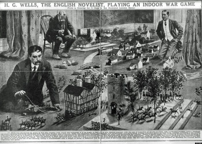 H. G. Wells pelaamassa sotapeliä. H. G. Wells julkaisi vuonna 1913 sotapelien sääntökirjan nimeltä: ”Little Wars: a game for boys from twelve years of age to one hundred and fifty and for that more intelligent sort of girl who likes boys’ games and books.” Illustrated London News, 25.1.1913.