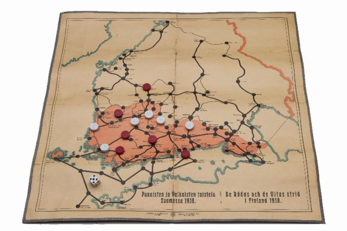 Punaisten ja Valkoisten taistelu Suomessa 1918 -peli. P.Juusela & Levänen Oy, valmistaja 1918. Museokeskus Vapriikin kokoelmat.