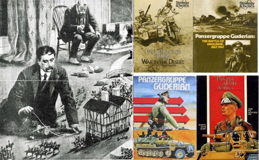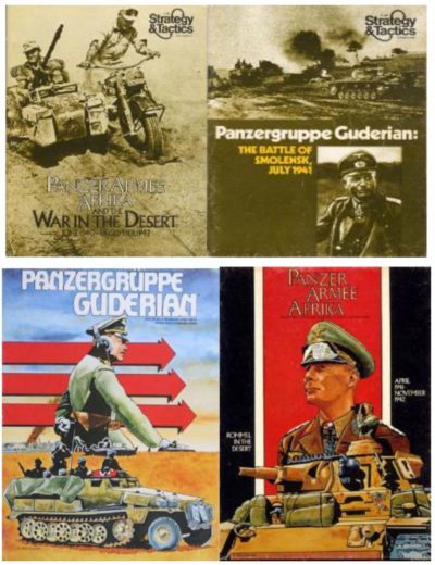 Yläkuvassa Erwin Rommelia ja Heinz Guderiania käsittelevien Strategy and Tactics pelien kansia; alakuvissa samojen pelien lautapeliversioiden kannet. Teoksen kuvitusta.